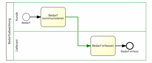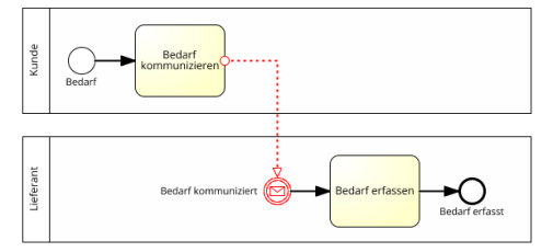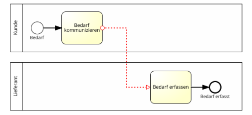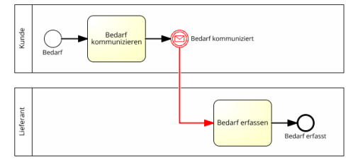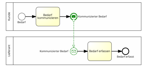 Zwischen Lanes innerhalb des selben Pools ist ein Sequenzfluss zulässig, da dieser sich in dem selben Verantwortungsbereich abspielt, und daher eine gesonderte Darstellung der Kommunikation dabei nicht erforderlich ist (es sei denn, dass der Modellierer diese darstellen möchte).